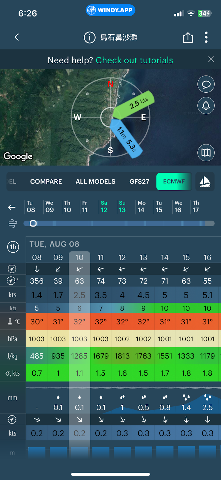 左:GPS航跡圖+風向紀錄。 中:長濱漁港外氣象預報。 右:烏石鼻海域氣象預報。