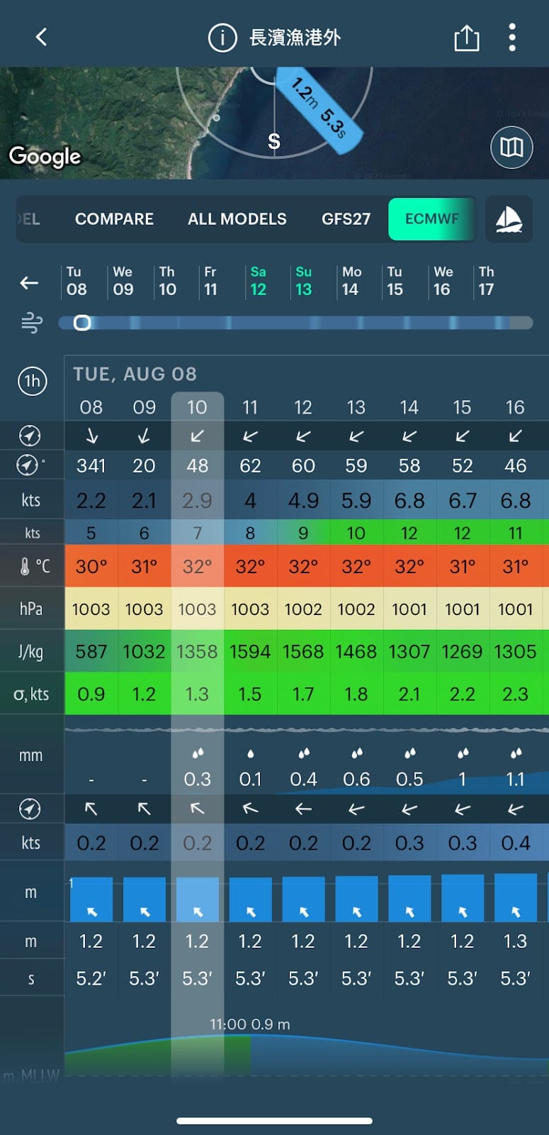 我推測原本的預報是由於陸地被曬熱,上午10點開始會有由海上吹向陸地的東風,是一種對流風。加上籠罩整個台灣南部的西南氣流,來到長濱地區加上對流風,就成為東南風。