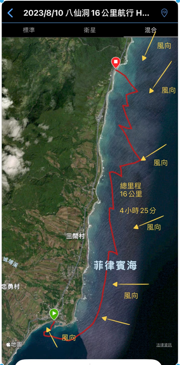 接下來風越來越向北偏,過了大俱來海域之後,已經成為東北風,向北航行太過於頂風,為了前進向北,我們開始完全用Z字型航線前進。因此最後一段航程,前進速度非常緩慢,進3步退2步,岸邊瞭望的人可能以為我們一直停滯。抵達八仙洞海域時,如小山一樣的浪湧過來。這就是氣象預報裡的「浪高1.3公尺,間距8.8秒」屬於長浪類型的嗎?我覺得浪高不只1.3公尺,也許是遇到較淺的地形湧起,應該至少有2公尺高。我們被抬升到浪尖後,看到一個大大的「下坡」,下坡後方好像有片草原那樣寬廣,然後又是一個大上坡,直到下一個浪尖。感覺到自己好渺小。