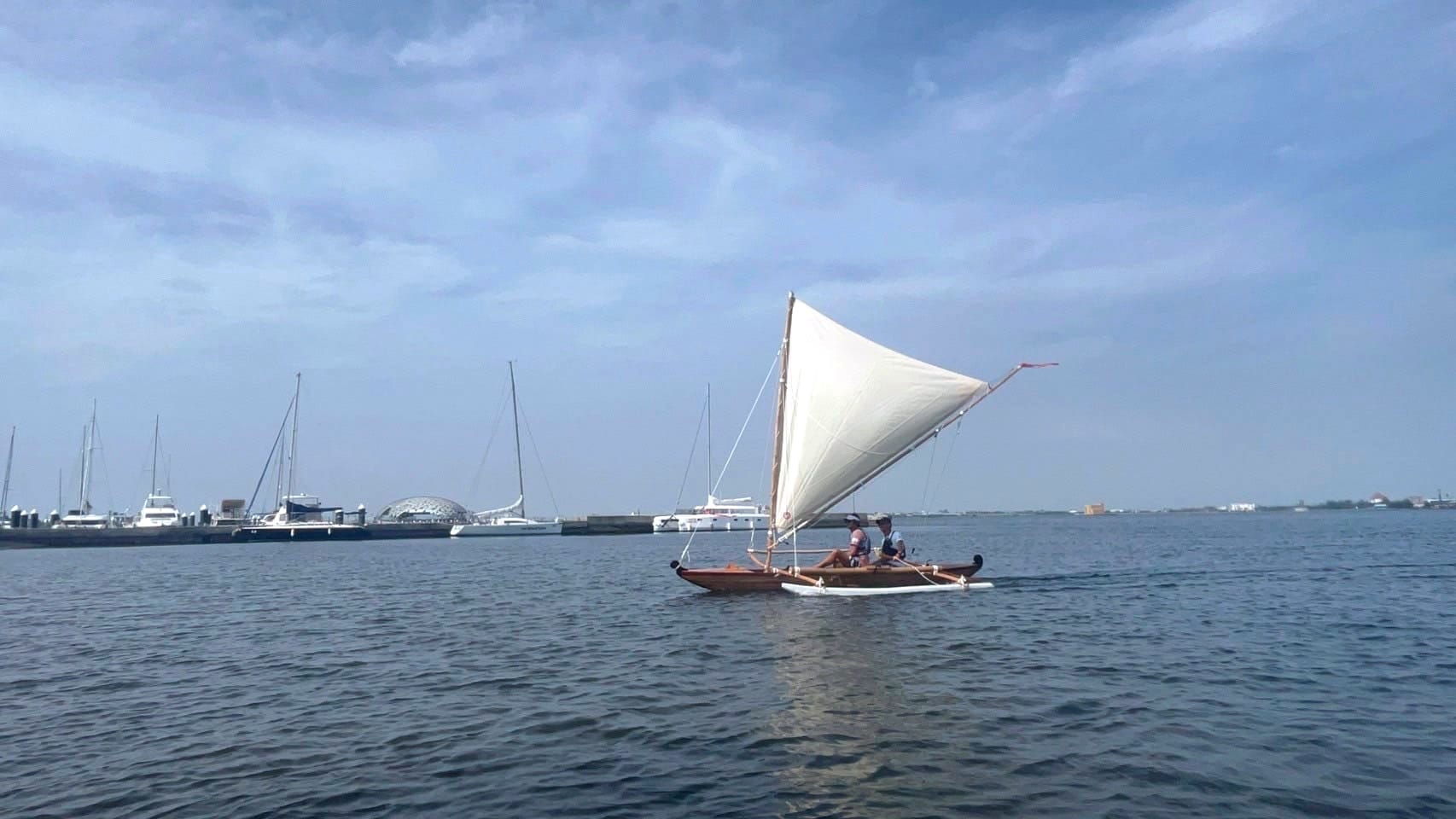 但這次在有風的情境下,帆船有跑起來的感覺。主繩稍微拉緊、再放鬆一點,就能感受到速度提升,這種細微的感覺是前所未有的體驗。另一個全新的感受,是順風轉向gybing時,帆轉向另一側、船突然往左邊傾倒的瞬間。這時掌舵的我下意識地往ama的方向壓過去,有趣的是,前方的夥伴也在同一時間往同一邊撲過去壓著。正因為兩人的體重加起來,才讓船沒有翻覆。